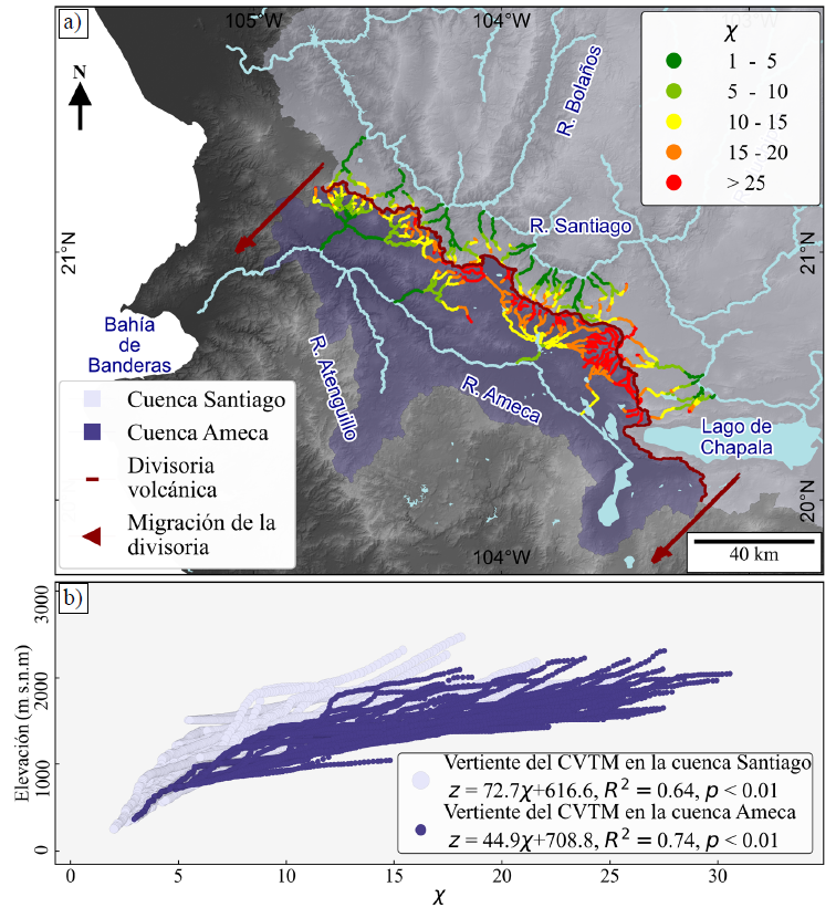 Figura 8 a) Mapa de distribución de los valores χ (integración del drenaje aguas arriba) de las vertientes de la FVTM, b) relaciones lineales χ versus elevación (z) de los ríos de las vertientes de la FVTM. Las relaciones lineales tienen correlaciones (R2) elevadas con valor de significancia (p) <0.01, lo anterior valida el cambio de gradiente en la elevación como una razón de cambio de la integración del drenaje aguas arriba. La pendiente en las regresiones es mayor en la vertiente de la Cuenca Santiago, siendo ésta última más erosiva y la que controla la migración de la divisoria principal hacia el sur.