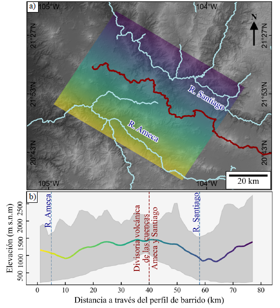 Los valores χ se calcularon con LSDTopoTools, aquellos que están en la vertiente norte de la FVTM (cuenca del río Santiago) fueron cartografiados y usados para hacer una regresión lineal con los valores de elevación. El proceso anterior se repitió para la vertiente sur de la FVTM (cuenca del río Ameca). Con los datos obtenidos se compararon ambas vertientes. La comparación de valores χ en las vertientes de la FVTM permitió dilucidar qué vertiente es más erosiva y controla la movilidad de la divisoria principal. El análisis con los valores χ fue complementado por medio de un perfil de barrido (swath profile) para el cual se utilizaron rectángulos de 1 km de ancho por 100 km de largo y alineados con los ríos Ameca y Santiago, a fin de cubrir la zona occidental de la FVTM. Para cada rectángulo se calculó la elevación mínima, media y máxima, de tal forma que se represente al relieve local o incisión total de las vertientes (p. ej. Montgomery y Brandon, 2002). Se procuró que dentro del perfil de barrido los ríos Ameca y Santiago fueran muestreados de forma perpendicular para con ello resaltar entre ambos las diferencias principales en términos de incisión. Finalmente, dentro del área del perfil de barrido, se calculó el volumen actual del perfil de los ríos Ameca y Santiago con el fin de estimar y comparar su incisión actual.
