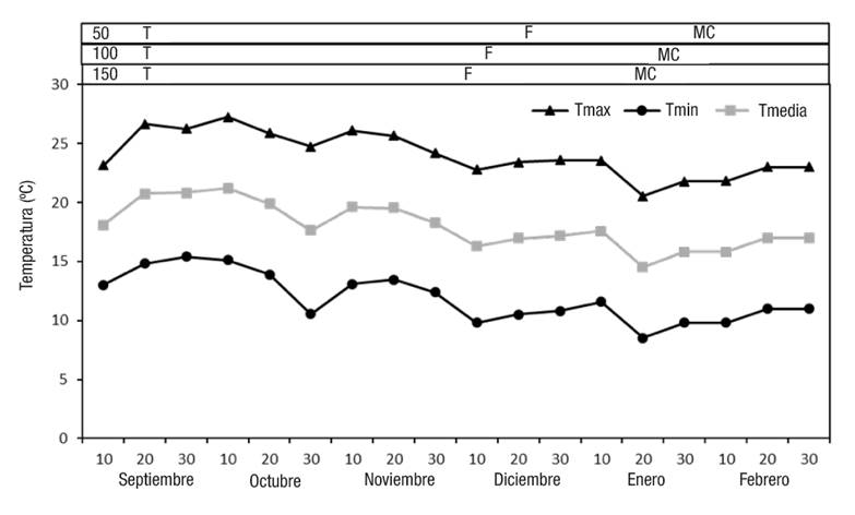 Figura 1 Promedios decenales (días) de temperaturas máximas (Tmáx), mínimas (Tmín) y medias (Tmedia) durante el desarrollo del cultivo de uchuva. T: trasplante, F: floración, MC: madurez de consumo.