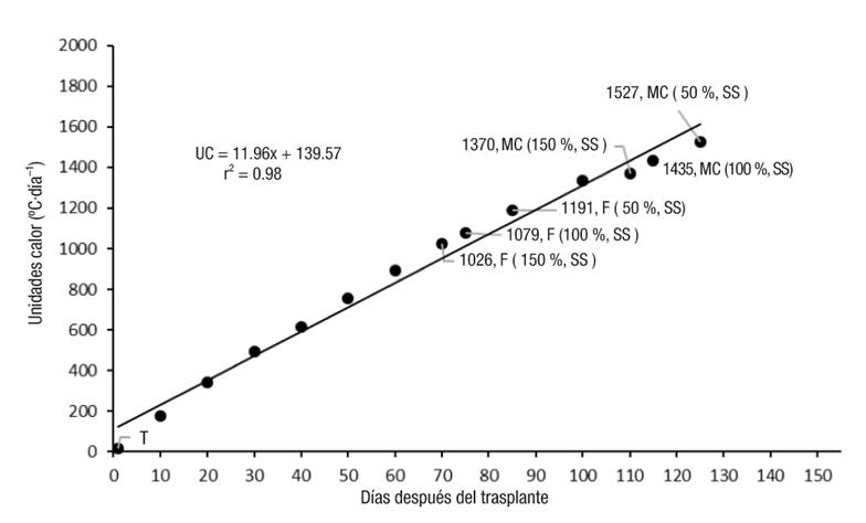 En la acumulación de UC durante el ciclo del cultivo (Figura 2), los totales fueron 1370, 1435 y 1527 UC, para las soluciones de Steiner al 150, 100 y 50 %, respectivamente. Es probable que esta tendencia también se deba a la mayor disponibilidad nutrimental en la solución nutritiva a 150 %, lo que favorece el crecimiento y desarrollo del cultivo. Los resultados del presente estudio son menores a los de Mora-Aguilar et al. (2006), quienes reportaron un total de 2,047 UC desde la emergencia hasta la madurez fisiológica en un ecotipo de uchuva proveniente de Perú. Dichas diferencias pueden atribuirse al origen del material genético evaluado, así como al periodo de cultivo.