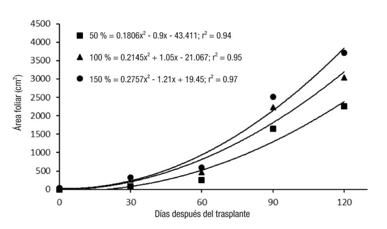 El crecimiento del cultivo se evaluó en función de las tres concentraciones de la solución nutritiva (50, 100 y 150 %), mediante muestreos destructivos de ocho plantas por tratamiento a los 30, 60, 90 y 120 días después del trasplante (ddt). En cada muestreo se contabilizó el número de hojas (NH) por planta y el área foliar (AF). Este último se determinó con un medidor de AF (LI-COR® 3100).