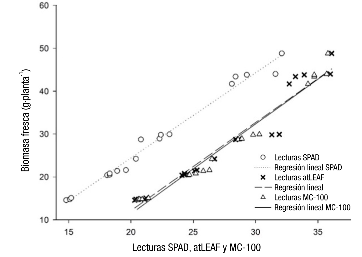 Las concentraciones de Chl y N determinadas en el laboratorio se correlacionan con las lecturas del SPAD en cultivos como el maíz (Zea mays), el trigo (Triticum aestivum) (Hurtado et al., 2010), el jitomate (Solanum lycopersicum) y la col (Brassica oleracea) (Macedo-Ferreira, Barbosa-Ferreira, Rezende-Fontes, & Pires-Dantas, 2006). Por otro lado, el sistema atLEAF tiene correlaciones altas en cultivos como el maíz, el trigo (Zhu, Tremblay, & Liang, 2012), la nochebuena (Euphorbia pulcherrima) (Dunn, Singh, & Goad, 2018a) y hierbas aromáticas como la salvia (Salvia splendens) (Dunn, Singh, Payton, & Kincheloe, 2018b). El medidor MC-100 es relativamente nuevo; Souza et al. (2019) reportan correlaciones estadísticamente significativas en pimiento dulce (Capsicum annuum).
