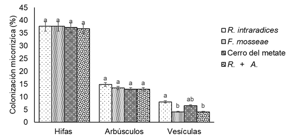 Los inóculos de HMA colonizaron las raíces de las plantas, ya que los porcentajes de colonización micorrícica por hifas fueron los más altos (35.9 - 37.7 %), seguidos por los arbúsculos (13.0 - 14.8 %); sin embargo, no hubo diferencias significativas (P ≤ 0.05) entre ellos (Figura 3). En cuanto a las vesículas, el intervalo fue de 4 a 8 %, y se encontraron diferencias (P ≤ 0.05) entre R. intraradices y el resto de los HMA. Estos resultados difieren con los reportados por Elhindi, El-Din, y Elgorban (2017), quienes encontraron un PCM entre 60.6 y 71.1 % en albahaca ‘Nano Compatt’; en tanto que Zulueta et al. (2016) reportaron PCM de entre 75 y 87 % en albahaca ‘Nufar’. Estas diferencias se pueden atribuir a las condiciones de cultivo, al uso de diferentes sustratos, a los HMA inoculados y al tiempo de exposición de las plantas al inóculo, ya que en esos estudios la duración de los experimentos fue de 70 y 120 días, respectivamente.