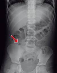 Figura 1: Placa simple de abdomen en la que se aprecia una rectificación antálgica de la columna. La flecha indica un asa fija en fosa iliaca derecha.