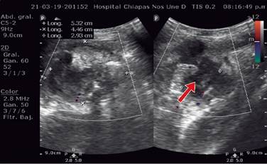 Figura 2: Estudio ultrasonográfico que muestra una colección líquida a nivel de cuadrante inferior derecho. La flecha señala la colección.
