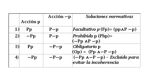 | Acción p | Acción ∽p | Soluciones normativas | |