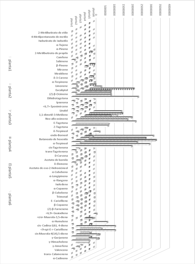 La caracterización química de los volátiles se realizó con un cromatógrafo de gases acoplado a un espectrómetro de masas (GC-MS Varian Star model CP-3800 GC, Palo Alto, CA, USA). Se utilizó una columna capilar FactorFour VF-5MS, de 30 mm de longitud con 250 micrones de diámetro interno (Varian, Palo Alto, CA, USA). La temperatura del horno de la columna fue programada con una temperatura inicial de 50 °C por 2 min y posteriormente 280 °C durante 10 min. El incremento de la temperatura fue de 15 °C/min, con helio como gas acarreador a un flujo constante de 1mL/min. La temperatura del inyector fue de 250 °C. El análisis por impacto electrónico con un haz de electrones de 70-eV para la ionización. La identificación de los compuestos se efectuó mediante la comparación del tiempo de retención y el espectro de masas con la biblioteca espectral NIST 2002. Una solución estándar de hidrocarburos (C12-C60) se inyecto para determinar los índices de retensión (IR) de los compuestos identificados. La abundancia relativa (%) de los componentes fue calculada considerando el área de los picos de todos los compuestos.