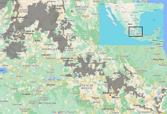 Figura 1 Mapa de localización del área de estudio. Las zonas en gris corresponden a la distribución geográfica potencial de las Praderas Intertropicales Templadas. [Fuentes: INEGI (2003), escala 1:1 000 000 (vegetación potencial) y Google My Maps (topografía, pueblos y carreteras)].