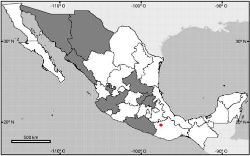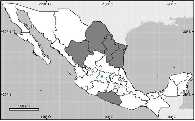 Figura 5 Distribución geográfica de Selaginella ribae en México. Los estados sombreados representan la distribución antes conocida; los cuadros verdes representan el nuevo registro en Querétaro y la confirmación de su presencia en Guanajuato. Mapa: INEGI (2017).