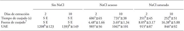 Curdling strength and units of enzyme activity (UEA) were significantly different among treatments. Curdling strength was not affected by storage time. In the extracts without NaCl, UEA was greater (Table 1), but the milk did not coagulate. The reason for this may have been that the NaCl modified the conformation of the protein space and the active site. Moreover, the diminishing effect of the NaCl on proteolytic activity of the treatments is explained by the fact that salt promotes dissociation of calcium and phosphates of casein micelles, affecting the colloidal state of the milk and producing electrostatic interactions with the charged amino acids. Although, NaCl at concentrations below 5.8 % (1 M) seems to stabilize the original protein folding (Chazarra et al., 2007), the method of applying the salt can affect activity, since high concentrations of NaCl delay proteolysis (Calvo et al., 2007).