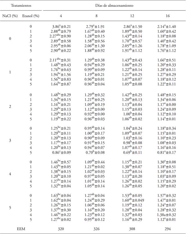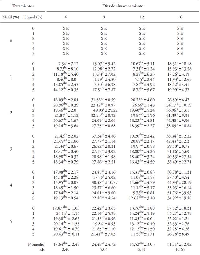 For the combined effect of NaCl and ethanol the experimental design was completely randomized with a 6×6×4 factorial array: six levels of NaCl (0, 1, 2, 3, 4 and 5 %), six levels of ethanol (0, 1, 2, 3, 4 and 5 %) and four storage times (4, 8, 12 and 16 d). When significant differences were found, the Tukey test was applied, p≤0.05 (Steel et al., 1997).