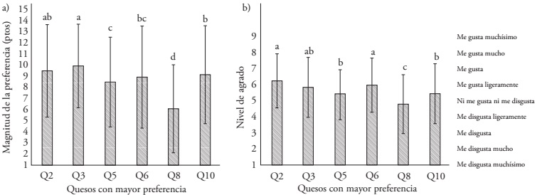 Figure 3 Preference and acceptance (±SD) of Chihuahua cheese. a) Estimation of preference magnitude with a 15-points linear scale. b) Acceptance test with a 9-point hedonic scale.