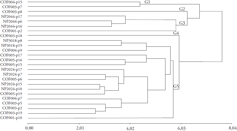 The cluster analysis revealed five groups (Figure 5). In the first group (G1) were COF004-p15 and COF003-p7, with higher yield, high percentage of defects and bean size larger than 7mm. The second group (G2) was COF003-p8 with high yield and few defects. The third group (G3) included NP2044-p17, NP2044-p6, NP2044-p16 and COF001-p2, which had low organoleptic scores. The fourth group (G4) was COF003p-18 with high organoleptic score and high green coffee yield. There were 17 individuals in group (G5) with medium size beans and few defects. Grouping the individuals with similar characteristics can contribute to selection of materials for industrial use. The first group had the two highest-yielding individuals, but they also had the largest quantity of defects. This last variable should be evaluated to differentiate defects caused by insects from those caused mechanically.