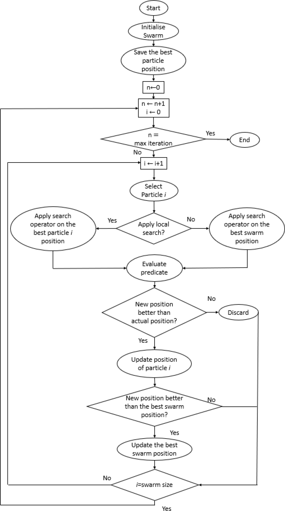 After creating this new position, the objective function will be used to evaluate it. If the new position is not better than the previous position, it is discarded, and the iteration ends. Whereas if the new position is better, it replaces the current position. Lastly, the position is compared with the best swarm position.