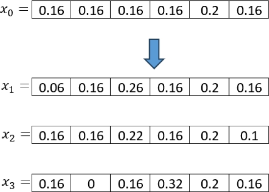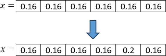 As shown in Figure 7, each index is assigned a budget percentage of 0.16 in the first step. However, when calculating the total budget for this solution, the result is 0.96. Because of this, the remaining 0.04 to reach 1.0 is randomly assigned to the 5th index.