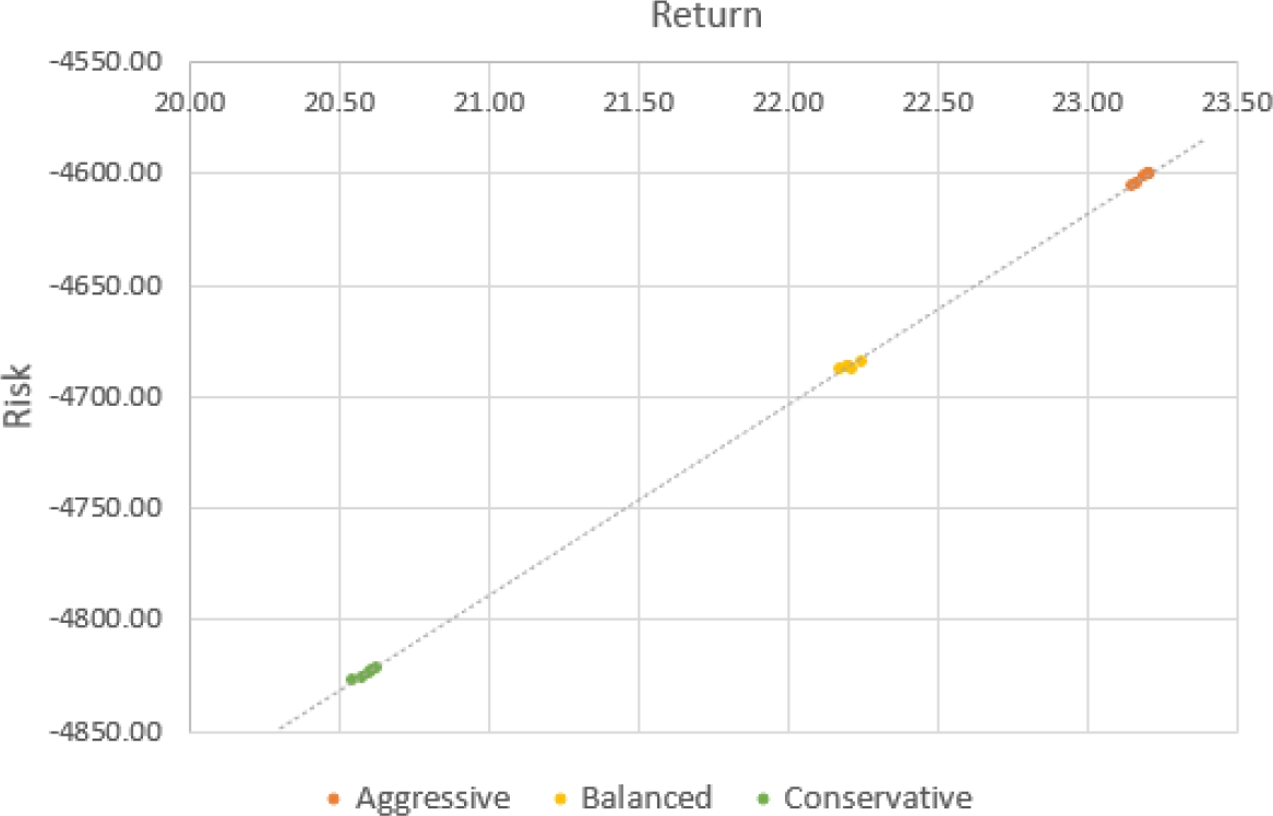 Figure 9 shows how the profile solutions reflect the desired preference. The aggressive profile obtains solutions that have the most return and risk, while the conservative profile favors those solutions with lower return and risk, and the balanced profile is between the two.