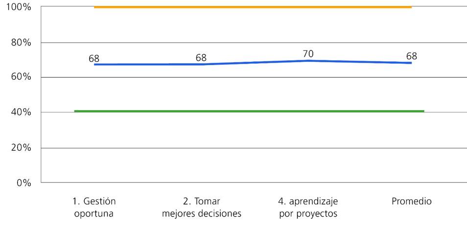 Esta dimensión comprende los ítems 1, 2, 4, que refieren a los siguientes enunciados del instrumento: 1: la información recibida de los cambios curriculares del nuevo Plan de Estudio en los CTE se presenta de manera oportuna, 2: la información recibida de la NEM les permite a los docentes tomar mejores decisiones para realizar cambios en los procesos educativos y 4: la información recibida de trabajo por proyectos en el CTE, es clara, oportuna y retroalimenta la información de los documentos recibidos. En la medición, el ítem 4 es el que alcanza uno de los valores de efectividad más alto (70%), por arriba del promedio, y el 68% de efectividad de valor alcanzado en los ítems 1 y 2.