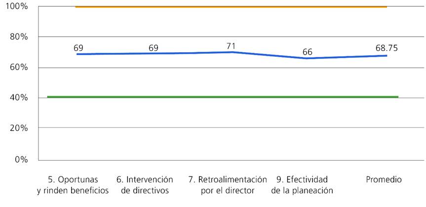 En esta dimensión se valoran cuatro ítems (5, 6, 7, 9). En el 5, las estrategias de planeación en el CTE han sido oportunas y rinden beneficios en los aprendizajes esperados para la movilización de saberes al aula; en el 6 la intervención de los directivos como estrategia en la operación de la implementación de la planeación en el CTE en el nuevo Plan de Estudios ha sido oportuna para su gestión con los docentes; en el ítem 7, la retroalimentación efectuada por los directivos en las exposiciones de los diferentes temas y actividades didácticas ha sido enriquecedora en la movilización de saberes; y en el 9, la efectividad de las estrategias de planeación y actividades pedagógicas para llevar a cabo el CTE ha resultado propia para la adquisición de nuevos saberes.