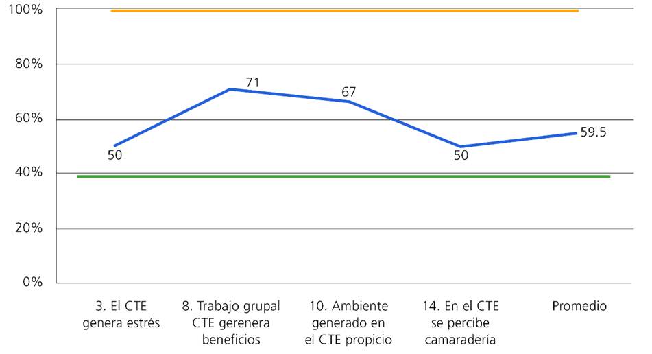En la prueba de contrastación de la hipótesis, los dos ítems que corresponden a la valoración del papel de director en el desarrollo de un liderazgo pedagógico son valorados como buenos, en el ambiente que se genera tanto para trabajo colaborativo como grupal. Sin embargo, con un nivel más bajo, el de mínimo aceptable, los participantes opinan que el CTE les genera estrés y en el compañerismo que se percibe. Lo cual coincide con los datos de la guía de observación y que se refleja en la poca interacción entre docentes (Tabla 4 y Figura 3).