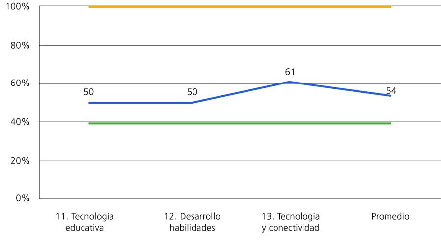 Esta categoría de análisis, que comprende la valoración realizada a los ítems, 11, 12 y 13, que integran el desarrollo e implementación de la tecnología a los procesos de aprendizaje y el desarrollo de habilidades digitales en docentes, apenas alcanza el 50% de efectividad. En promedio, se percibe una afinidad al desarrollo del modelo educativo. En la prueba de contrastación de hipótesis se rechaza la nula, en el nivel de mínimo aceptable, en el desarrollo del ambiente escolar, de participación y confianza. La valoración de tecnología y conectividad para el desarrollo de actividades escolares en las instituciones donde laboran los docentes alcanza un 61% de efectividad, se encuentra en el nivel de desarrollo como modelo educativo y en el de bueno en la contrastación de la prueba de hipótesis.