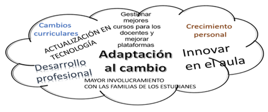 También comentan que, para la profesionalización docente, requieren profundizar en los cambios curriculares ofrecidos en los nuevos planteamientos y que todas estas innovaciones los conducen a un crecimiento profesional y a tener mayor involucramiento con las familias de los estudiantes y con los problemas de la comunidad. Sin embargo, lamentan que el trabajo administrativo los limita en ocasiones para desarrollar actividades más creativas en el aula, agradecen ser tomados en cuenta para crear una mejora en la educación e involucrarse en los cambios provocados (Figura 5).