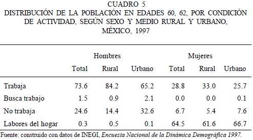 En parte, esta situación se muestra en las cifras del cuadro 4, donde se muestra la poca participación de la cohorte 1936-1938 en el sistema de pensiones y lo magro de los beneficios. Estas consideraciones deben tomar en cuenta que se trata de las edades (60-62), donde se encontrarán personas con salud y capacidad de trabajo que en esas edades no requieren ni procuran una pensión. En todo caso, incluso este grupo está escasamente cubierto por la seguridad social y son muy pocos los pensionados. Las preguntas son, entonces, sobre sus medios de subsistencia y la participación en el trabajo. En el cuadro 5 aparece la condición de actividad de la cohorte 1936-1938, en cifras que toman en cuenta el sexo y los medios rural y urbano presentes en este análisis.