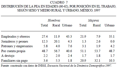 En las ocupaciones rurales de la población masculina de la cohorte 1936-1938 la posición en el trabajo es primordialmente "por cuenta propia" y como "jornaleros o peones", en porcentajes de 56.7y de 20.1 por ciento, respectivamente, como se ve en el cuadro 7. En la parte urbana, los hombres que trabajan se desempeñan en 43.3 por ciento como empleados y obreros y 40.6 por ciento se dedican a actividades por cuenta propia.9 La gran presencia del trabajo por cuenta propia también alude a la limitada cobertura de la seguridad social y de jubilaciones de retiro, lo cual obliga a la continuidad en el trabajo en la forma de autoempleo, mientras se tenga la capacidad para hacerlo (Schulz, 1991).