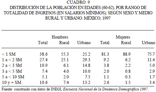 A las estadísticas y explicaciones sobre la actividad y ocupación económica en las edades avanzadas se añade el cuadro 9, en el que se expresa la distribución de las personas de la cohorte 1936-1938, de acuerdo con la totalidad de los ingresos, también en términos de rangos de salarios mínimos, por sexo y por nivel rural y urbano.