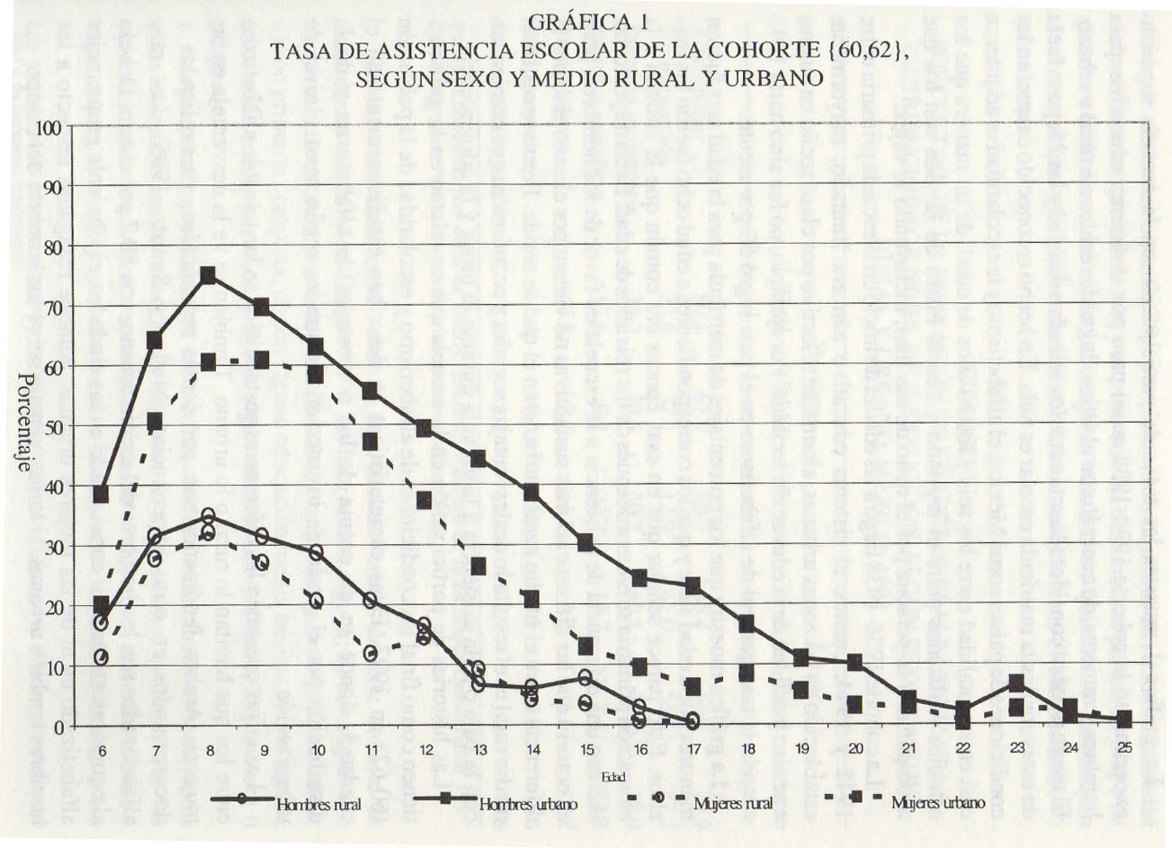 La gráfica muestra que los porcentajes de matrícula para la edad seis fueron menores que a edad siete y que los correspondientes a edad ocho fueron los más altos. Esto parece señalar que en esas épocas era común que la entrada a la educación primaria se hiciera después de los seis años de edad. Estas trayectorias indican una diferencia de asistencia a la escuela en favor de los hombres, pero es notorio que las diferencias más sustantivas no vienen por el sexo sino por la diferencia entre el medio rural o urbano en el que se reside. Permanecer en el medio rural es el resultado de desventajas sociales y económicas que comienzan con la baja o nula asistencia a la escuela durante la niñez y la adolescencia.