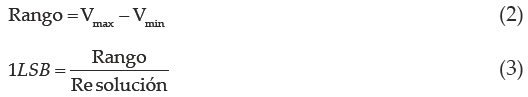 El número de bits de un módulo de adquisición de datos, se refiere al conversor analógico-digital y el rango de la diferencia entre el valor máximo y mínimo de tensión admitida en la entrada. El módulo OMB-DAQ-3000 tiene una resolución de 16 bits en su conversor analógico-digital, lo que indica que es capaz de representar 65536 combinaciones binarias. Sabiendo que en el intervalo de lectura del OMB-DAQ-3000, el máximo voltaje (intervalo) de éste es 10 V y el mínimo (1LSB) es de 100 mV, este valor se calcula con la ecuación 2, mientras que el bit menos significativo (LSB) es comprendido como el valor mínimo de voltaje que será detectado y almacenado en un número binario y se calcula con la ecuación 3