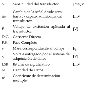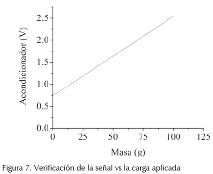 La celda de carga LCFA tiene una sensibilidad de 2.2 mV/V, esta señal se amplifica por medio de un acondicionador ITMA-DC que proporciona 12 bits de resolución con una ganancia de 238.05. Para garantizar la linealidad de la señal, se realizó una serie de pruebas con el sistema celda-acondicionador, la ecuación de linealidad resultó como lo muestra la figura 7.