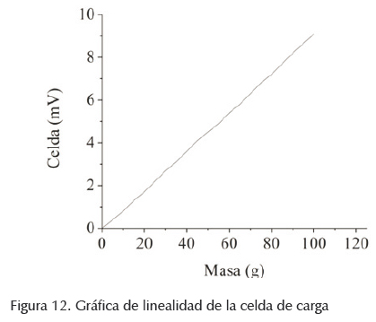 Para la validación del protocolo de funcionamiento del MUA, se calibró la celda de carga con diferentes pesos proporcionados al sensor dentro del rango de interés, observando una linealidad uniforme con una R2 de 0.9998 como se puede apreciar en la figura 12. Esto corresponde a la confiabilidad y exactitud de datos que se esperan obtener durante una prueba de carga variable utilizando técnicas de tensión para obtener la resistencia a tensión de una fibra o película, al igual que la resistencia a cortante por el método de microgota (aplicados por protocolos de prueba).