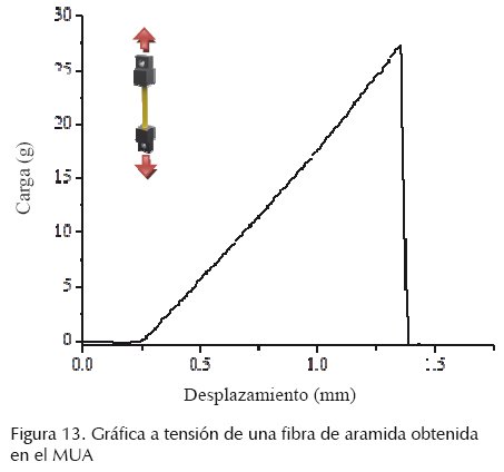 Adicionalmente se probó a tensión una fibra de aramida Kevlar 129 (ASTM D-3822, 2001), la cual es bien conocida y caracterizada en el ámbito científico. Las pruebas se realizaron con una longitud de prueba de 25 mm, con diámetros de fibra de alrededor de 12 μm, a una velocidad de prueba de 0.2 mm/min, con una relación de adquisición de 25 datos/seg. Con estas pruebas se adquirieron datos típicos de la fibra, obteniendo un módulo elástico de 97 GPa con una desviación estándar de 0.95 GPa de un lote total de 10 muestras, donde la literatura reporta un valor de módulo elástico de alrededor de 99 GPa (Yang, 1988). En la figura 13 se presenta una curva típica de carga y desplazamiento obtenida de esta prueba. La primera sección de la curva donde no se ve carga, está relacionada con el ajuste natural que requiere el material de prueba, hasta que aproximadamente a 0.25 mm de desplazamiento, se puede notar una clara carga soportada por la fibra con un comportamiento típico elástico hasta su falla, donde luego se aprecia la caída repentina de la carga.