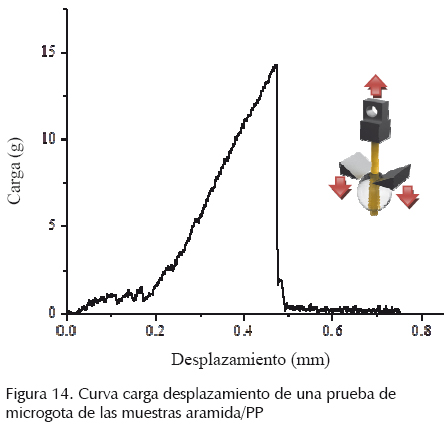 Como parte de la validación del equipo se realizaron pruebas interfaciales de extracción de fibra de aramida con una matriz de polipropileno. Esta prueba llamada también de microgota (representada en figura 1b), ya que consiste en el desprendimiento de una gota polimérica embebida en una fibra por el efecto de una fuerza de arrastre. Estas pruebas reportaron valores de IFSS de alrededor de 2 MPa (fuerza/área embebida), muy similares a los que reporta la literatura (Carrillo, 2012). La figura 14 presenta la curva típica carga y desplazamiento obtenida de estas pruebas con gran fidelidad gracias a la alta adquisición de datos acumulados que el equipo es capaz de ofrecer durante una prueba (20 datos/seg). El ruido observado en la curva es típico de este tipo de prueba debido a la fricción entre las dos partes de los constituyentes poliméricos, obteniendo valores de carga a cortante en la prueba de alrededor de 14 g, correspondiente a este arreglo (Carrillo, 2012).