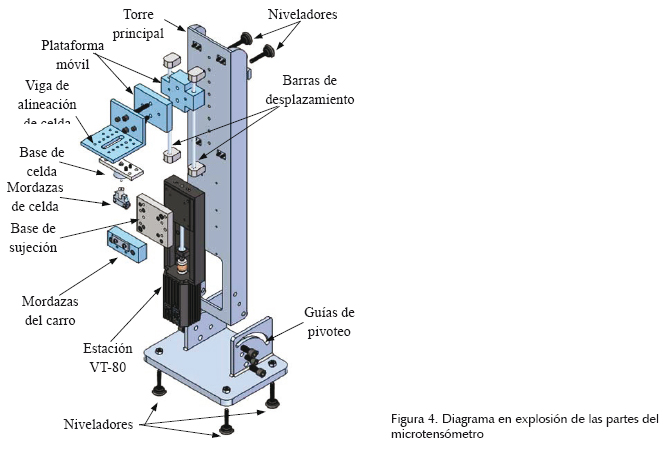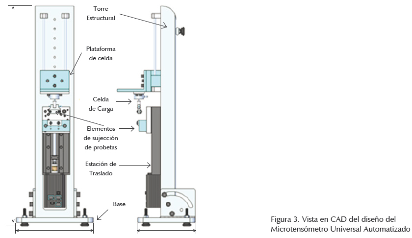 El equipo diseñado y construido en este proyecto, llamado microtensómetro universal automatizado (MUA) tiene el objetivo principal de proporcionar cargas a tensión o compresión en diferentes formatos de pruebas, que pueden ser plasmados en una gráfica carga-desplazamiento para fibras poliméricas y materiales compuestos a nivel micromecánico. En la figura 3 se muestra el diseño y el acoplamiento de las partes principales que componen el presente equipo.