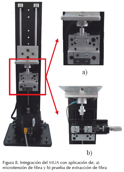 En la figura 8 se puede observar el MUA integrado con el accesorio para tensión de monofilamento (figura 8a) y para el jalado de fibra por microgota (figura 8b).