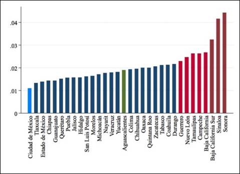 Nota: Para las estimaciones se utilizaron los siguientes valores: educación= 6 (secundaria completa); integrantes= 4; sexo= 0; ingreso= 9.21 (correspondiente a un ingreso de 10000); est_socio= 3; precio= 0.745 en 2012 y .93 en 2016 y 2018. Aguascalientes es el estado base para ES.