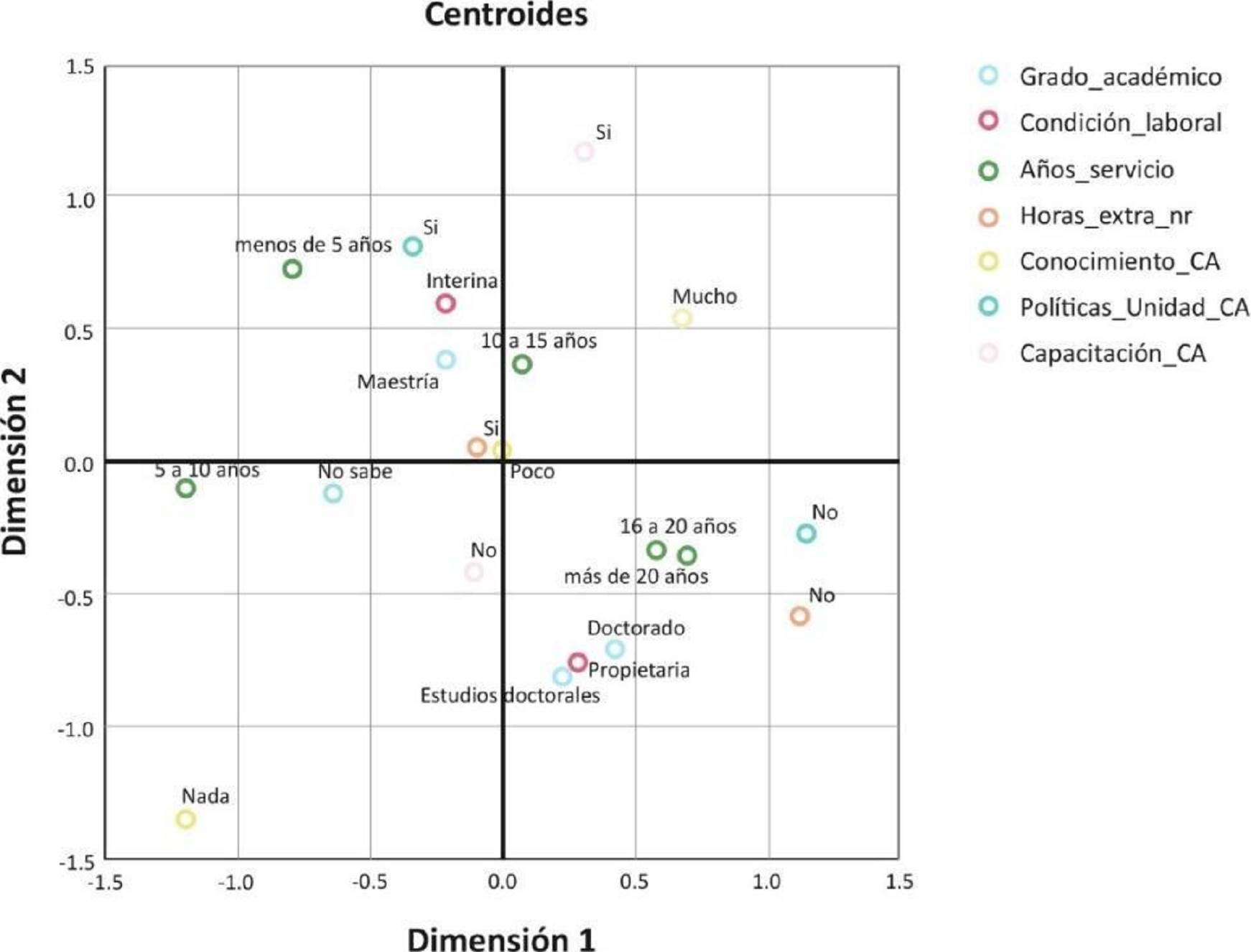 Dentro del conjunto Y, las variables que aportaron mayor contribución al modelo fueron la existencia de políticas para la implementación de CA (0.679) en la dimensión D1 y la capacitación recibida en los últimos 6 meses (0.458) en la dimensión D2. Para este conjunto, las categorías “no contar con políticas para la implementación de CA” y “haber recibido capacitación en CA”. La distribución del grupo de entrevistadas se presenta en la Figura 1. Esta distribución revela que las mujeres con una mayor antigüedad laboral (16 años o más), con estudios doctorales o doctorado, propietarias y que no indican dedicar tiempo extra no pagado a actividades laborales, reportan el no contar con políticas establecidas para la implementación de CA en la institución donde trabajan.
