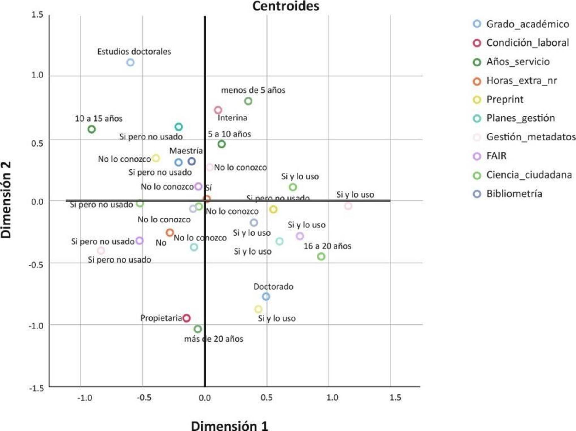 Se concluye que tanto las características laborales como el conocimiento en CA están significativamente correlacionadas y que estas relaciones se manifiestan de manera distinta en las dimensiones canónicas. La antigüedad y la contratación laboral en propiedad parecen influir de manera importante en la percepción y la implementación de políticas de CA. Además, la existencia de políticas y la capacitación reciente en CA juegan un papel crucial en la gestión de metadatos, aunque su impacto varía según las dimensiones canónicas analizadas.