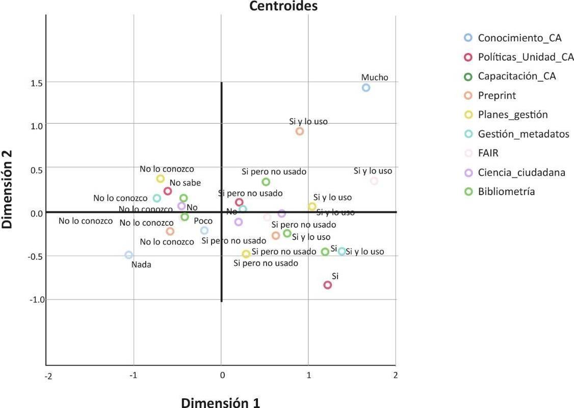 En cuanto a las categorías con mayor contribución, se observa que para la variable CCA, fue tener "mucho conocimiento" en CA (2.400), seguida por la clase "nada de conocimiento" (-1.210). Para la variable de planes de gestión, las categorías con mayor contribución fueron "no la conozco" (-1.108) y "sí la conozco, pero no la uso" (1.602). En la variable preprint, las categorías con contribuciones significativas fueron "la conozco y la uso" y "no la conozco", con ponderaciones de 1.799 y -0.761, respectivamente.