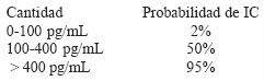 La probabilidad de insuficiencia cardíaca respecto al BPN ha sido propuesta como sigue: