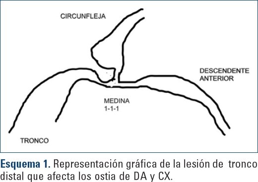 Se trata de un paciente varón de 83 años de edad, exfumador y dislipémico, con antecedente de cardiopatía isquémica sometida a revascularización percutánea (RP) sobre descendente anterior (DA) media y circunfleja (Cx) proximal en 2001. Ingresa en la unidad de cuidados intensivos del centro de los autores con el diagnóstico de síndrome coronario agudo sin elevación del segmento ST (SCASEST) tipo infarto agudo de miocardio sin elevación del ST (IAMSEST). El electrocardiograma de ingreso no presenta alteraciones agudas de la repolarización y en el ecocardiograma se documenta una función sistólica biventricular conservada sin alteraciones de la contractilidad segmentaria ni valvulopatías significativas. La coronariografía diagnóstica muestra una lesión grave de 85% con abundante calcio en el tronco coronario izquierdo (TCI) que afecta a los ostia de DA y CX, con Medina de 1-1-1 (Esquema 1) y (Fig. 1A y B). Stents implantados sobre DA y Cx, sin reestenosis.