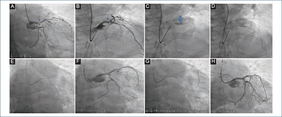 Figura 1 Revascularización coronaria percutánea del tronco coronario izquierdo con litoplastia coronaria. A y B: Angiografía basal. C-G: Balón de litoplastia e implante de stents. H: Resultado final.