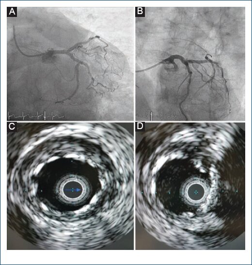 En virtud del grado de enfermedad y la angulación grave en la salida de ambos ostia coronarios (DA y CX) se optó por una revascularización de TCI de doble stent (T-stent). Así se implantó un primer stent farmacoactivo de 3.5 mm sobre la Cx proximal ajustado al ostium y se liberó un segundo stent de everolimus de 3.5 mm sobre TCI-DA. Se optimizó el resultado final mediante técnica de POT con posdilatación con balones no distensibles sobre TCI (Fig. 2A y B) y se comprobaron adecuadas expansión y aposición del stent en TCI mediante IVUS (Fig. 2C y D). El paciente recibió el alta bajo doble antiagregación con AAS y clopidogrel, sin mostrar incidencias.