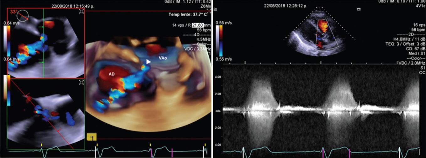 En la última consulta de seguimiento, en enero de 2020, como hallazgos relevantes se encontró una comunicación residual ligera y prótesis mitral con insuficiencia leve propia del mecanismo, con Doppler continuo un gradiente medio de 5 mmHg, normofuncionante. El paciente permanece asintomático (Fig. 4).