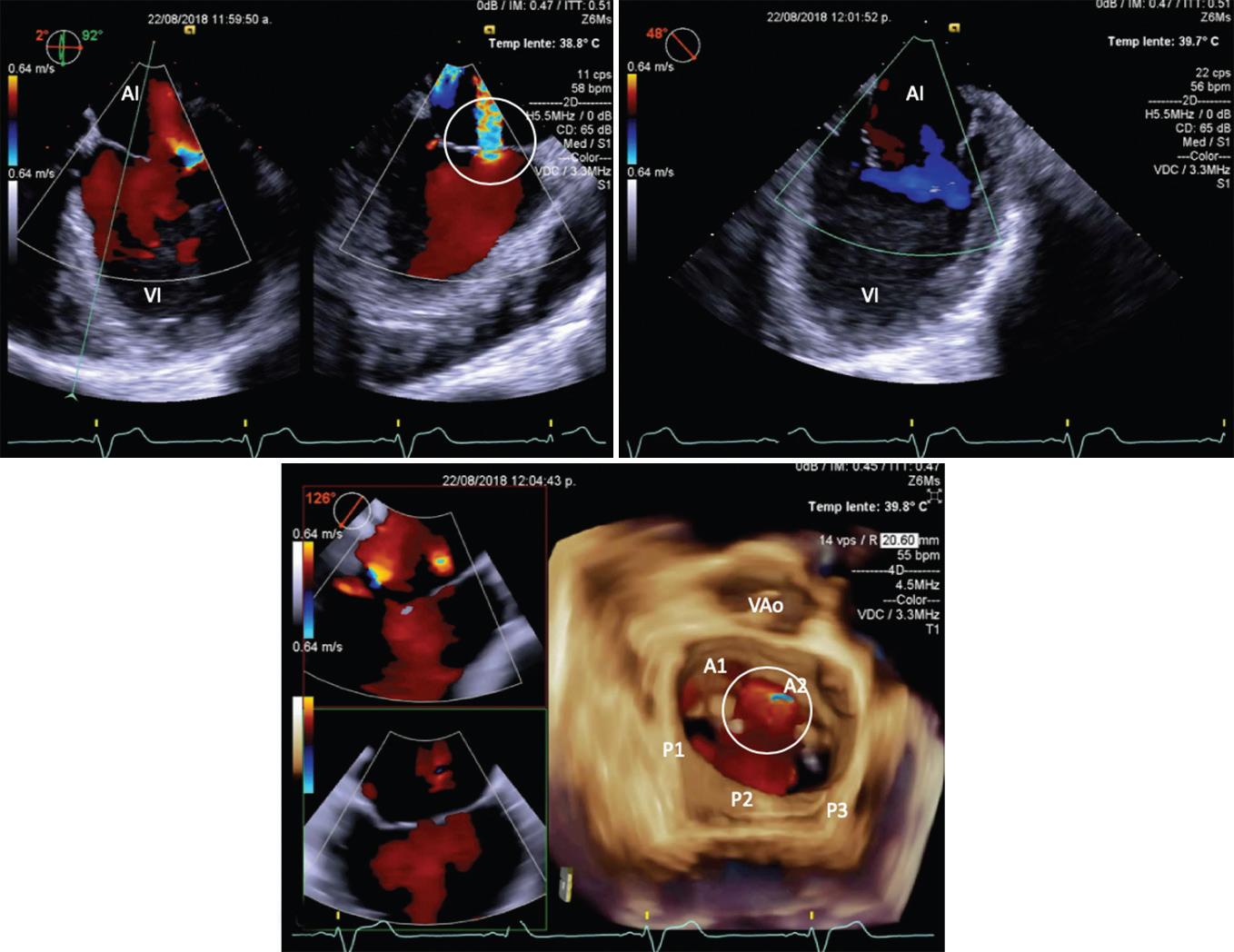 Figura 3 Ecocardiograma transesofagico. A: Aproximación medioesofágica de cuatro cámaras enfocada a la válvula mitral y vista ortogonal a 90° en dos cámaras, en la que se evidencia una insuficiencia mitral grave secundaria a perforación del segmento A2 de la valva anterior de la válvula mitral (círculo). B: Aproximación bicomisural. C: Vista tridimensional de la válvula mitral en la que se observa el segmento afectado (círculo).