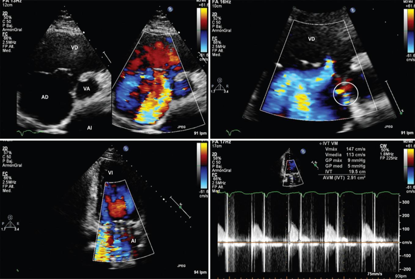 Figura 4 Ecocardiograma transtorácico posquirúrgico. A: Aproximación paraesternal en el eje corto a nivel de los grandes vasos, vista comparativa bidimensional y Doppler color, en los que se observa una insuficiencia tricuspídea moderada excéntrica, y en un acercamiento. B: puede verse una comunicación residual ligera (círculo). C: Aproximación apical de dos cámaras en la que se evalúa la prótesis mitral, con una ligera insuficiencia propia del mecanismo. D: Evaluación Doppler espectral continuo, se observa gradiente medio de 5 mmHg, normofuncionante.