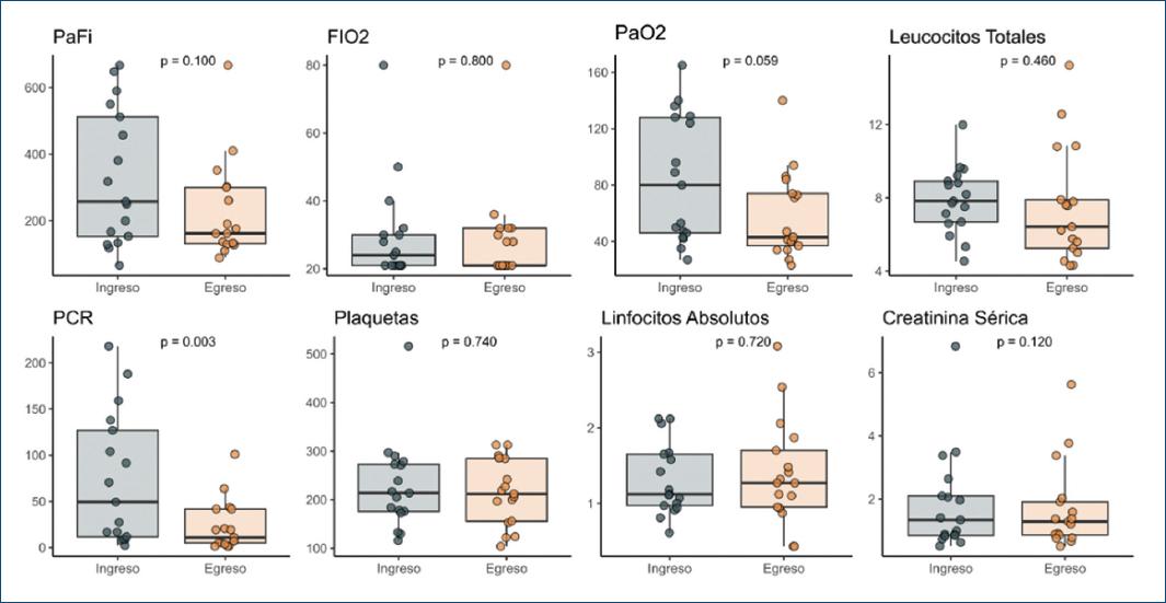 Se compararon la PaFi, la FiO2, la PaO2, los leucocitos totales, la proteína C reactiva, las plaquetas, los linfocitos y la creatinina del ingreso y del egreso de los pacientes. La figura 1 consta de ocho gráficos de cajas y bigotes que muestran la distribución de las variables bioquímicas y gasométricas de interés, al ingreso y al egreso hospitalario. Destaca que tanto la PaFi como la PaO2 disminuyeron de manera importante al egreso hospitalario; sin embargo, la diferencia no fue estadísticamente significativa (p = 0.100). En el caso de la FiO2, los leucocitos totales, las plaquetas, los linfocitos absolutos y la creatinina sérica no se observó una disminución estadísticamente significativa al egreso. Únicamente en la proteína C reactiva se observó que la mediana al egreso fue significativamente menor en comparación con la mediana al ingreso (p = 0.003).