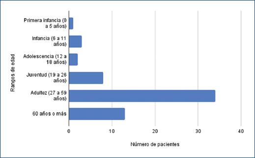 En cuanto a la edad, en los casos descritos en el INCICh encontramos un predominio en la adultez (27 a 59 años), lo que coincide con los resultados de otros estudios, que reportan un promedio de 49 años12. En una serie de 51 pacientes con reacciones cutáneas adversas graves en un hospital de tercer nivel en Jamaica, las décadas más afectadas fueron la cuarta, la quinta y la sexta33. Si bien la adultez no representa por sí misma un grupo etario de riesgo, en nuestro estudio la mayor parte de la muestra eran adultos, factor que pudo influir en los resultados obtenidos.