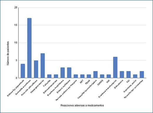 También se evaluó la gravedad de la dermatosis tomando en cuenta el riesgo-beneficio respecto a la suspensión del medicamento asociado. En la mayoría de los pacientes se tomó la decisión de continuar con el tratamiento por ser indispensable para sus comorbilidades. En quienes se identificó el fármaco causal, este fue suspendido y sustituido, en su caso, por otro. En todos los casos se indicaron medidas generales del cuidado de la piel y en los necesarios se emplearon antihistamínicos o esteroides tópicos y/o sistémicos.
